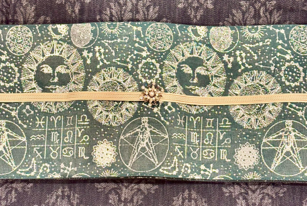 お気に入りのアラベスク柄デニム着物に 西洋占星術な星座モチーフ半幅帯と、