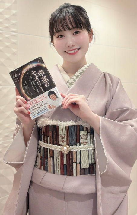本の柄が並ぶ帯を主役にして、淡いくすみピンクの色無地着物を合わせた